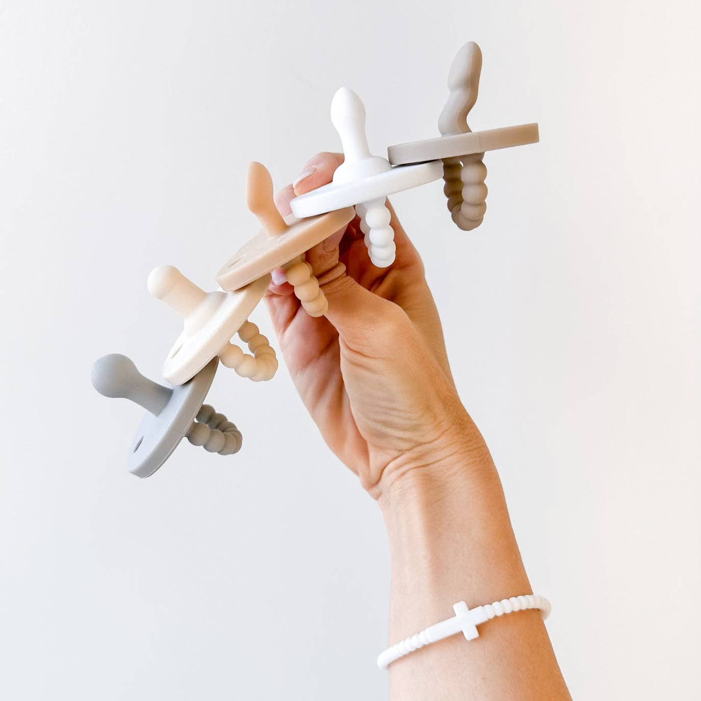 The Cutie PAT (Pacifier And Teether) is a multifunctional 2-in-1 patented design. The nipple was created to soothe, while the teether was developed to aid in teething relief. All Cutie PAT styles are a safe, one-piece design made out of 100% medical-grade silicone. They have a large shield for teething, and large holes for safe breathing. The teether handle provides comfort for sore gums, and also makes it easy for baby to hold and place in their mouth.