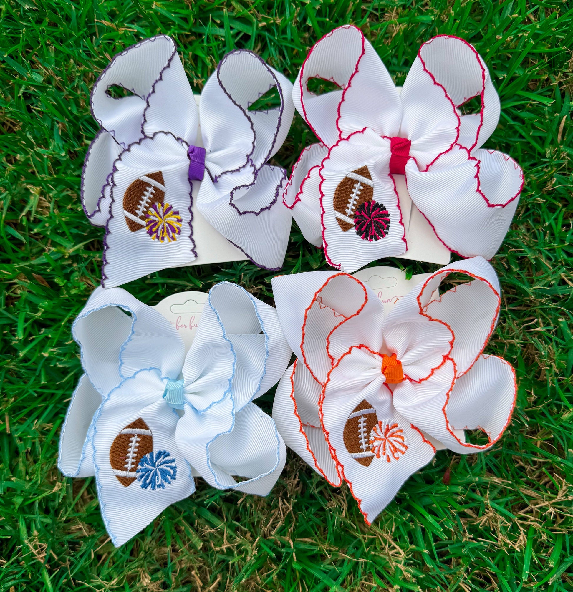 Ready, set, cheer! Our newest collection is bringing all the touchdown-worthy cuteness to her game day wardrobe! Whether she’s repping her school colors or just loves a little pom pom flair, these bows are the perfect sideline statement.All bows are 5.5 inch